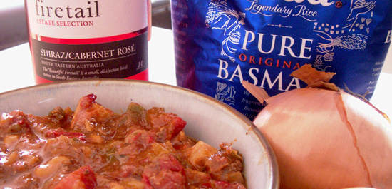 This evening I chose to serve with rice. Now I’m not a rice lover at all, I find after a few mouthfuls I’m bored with it. But I have found a way to make it more interesting. So tonight I fried off some finely chopped onion in olive oil and then when the rice was cooked, as always in my microwave rice cooker, I mixed in the fried onions with the olive oil. Worked wonders, I went back for a second and third helping.